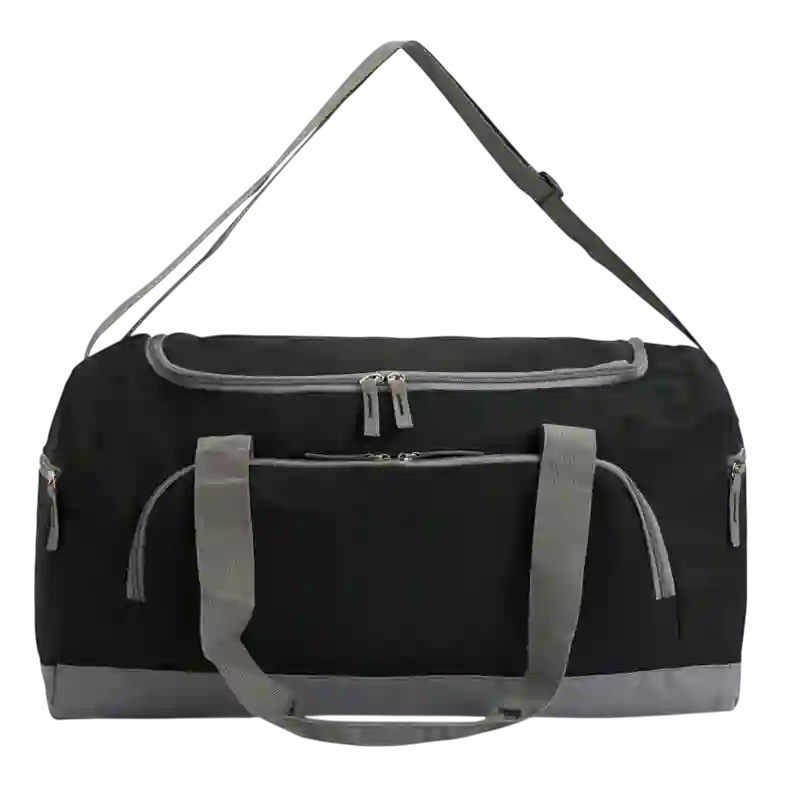Bolso deportivo. Tela Poliéster 600D. Compartimiento principal con cierre, bolsillos delanteros y laterales. Correa regulable. Medidas: 50 x 26 x 24 cm. Disponible en negro con detalles grises