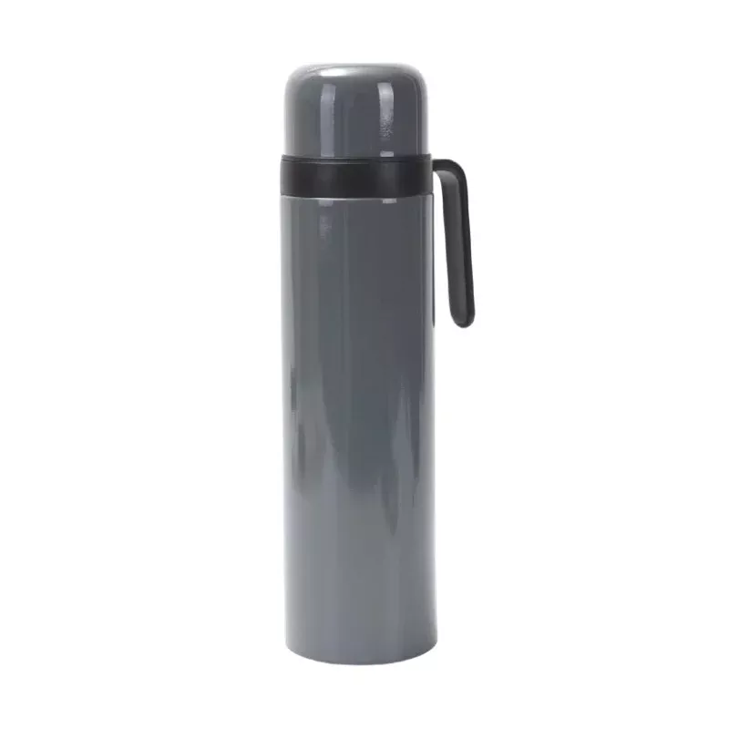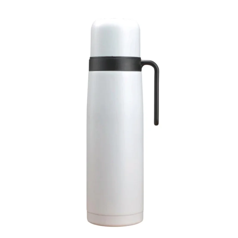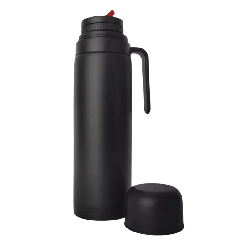 Termo de 1 litro de capacidad, diseñado para mantener la temperatura de sus bebidas durante extensos períodos.Termo fabricado con acero inoxidable 304 en su interior que garantiza resistencia a la corrosión, y acero inoxidable 201 en su exterior, que proporciona durabilidad y un acabado resistente en color blanco. Incorpora un práctico pico cebador que permite verter líquidos de manera controlada y precisa. Su diseño se caracteriza por una media manija lateral, que facilita el agarre y el transporte del termo de forma cómoda y segura.Su diseño de doble pared con aislamiento al vacío asegura una retención térmica superior manteniendo las bebidas calientes por horas y las frías aún más tiempo.Colores: negro, blanco, gris, verde, azul, celeste