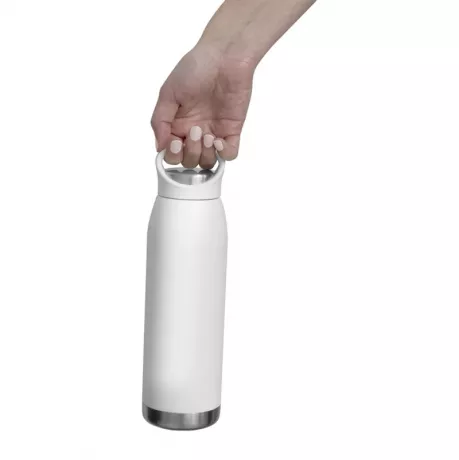 Ø 7,6 x 26,5 cm. Capacidad 600 ml. Acero inoxidable. Botella doble pared, sellada al vacío. Interior en acero 304 y exterior en acero 201. Pintura en colores mate. Tapa combinada en plástico del mismo color de la botella y acero inoxidable 201. Mantiene hasta 12 hs la temperatura de las bebidas calientes y 24 hs de las bebidas frías. Presentación en caja de regalo.