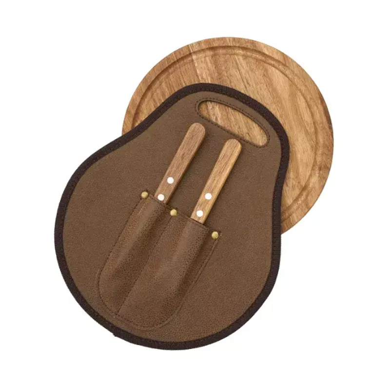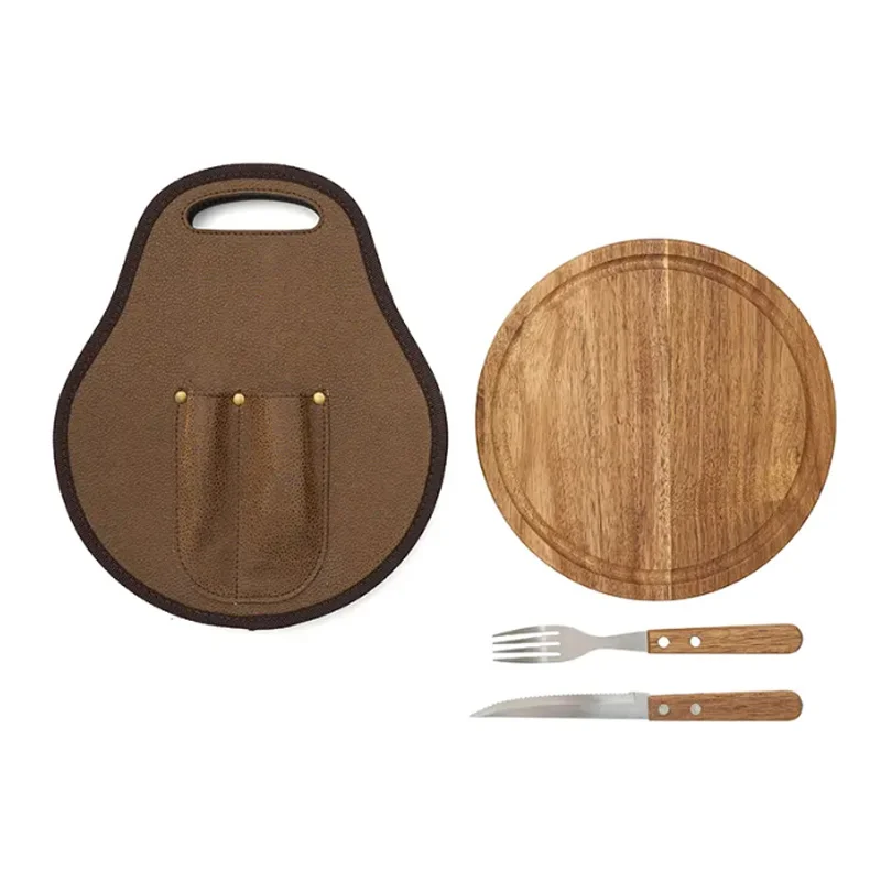 Set de asado con tabla y utensilios. Hecho de madera de acacia, cuero y acero inoxidable. Cuenta con tabla redonda con mango, cuchillo y tenedor, todo guardado en una bolsa de cuero con cierre tipo estríbo. Es ideal para disfrutar de un asado al aire libre o en casa en un formato compacto y funcional.