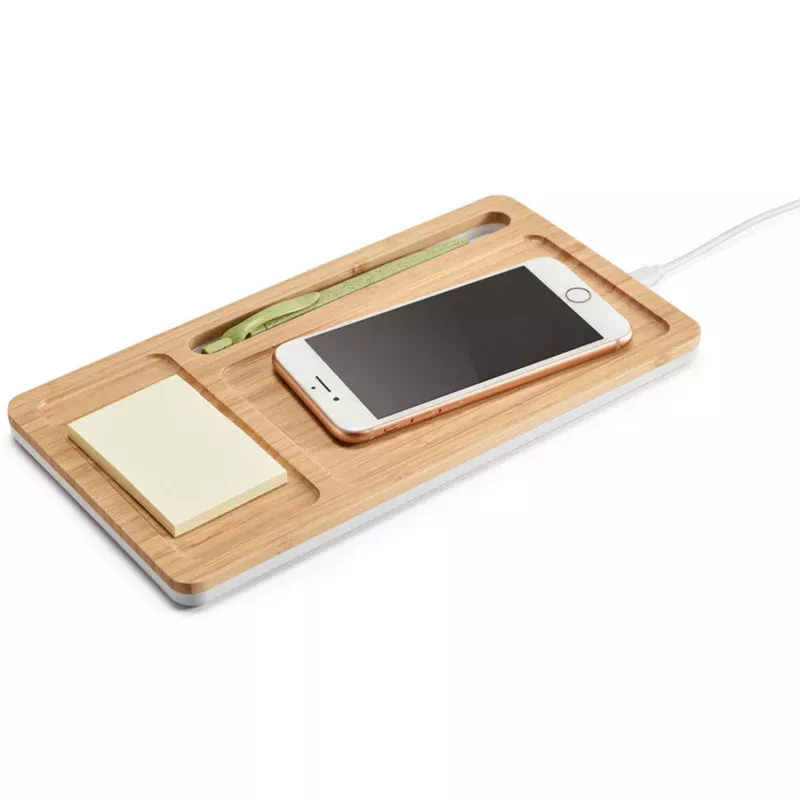 Organizador de bambú y ABS con cargador inalámbrico - Solamente compatible con teléfonos inteligentes con tecnología de carga inalámbrica - Multipuerto USB y soporte para teléfono móvil - Incluye cable USB / tipo C de 90 cm para cargar - Entrada 5V/1.5A. Potencia máxima de salida de 5W. 1 puerto USB y 1 puerto USB tipo C. - Suministrado en una caja de regalo 28 x 14,5 x 2,5 cm
